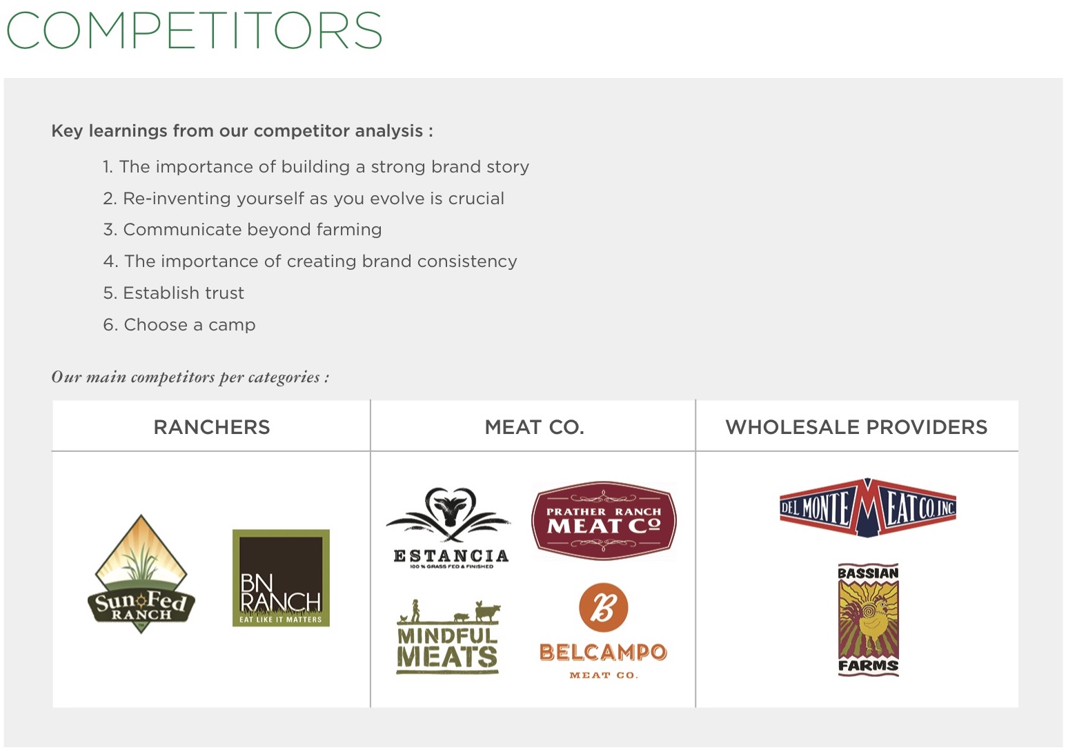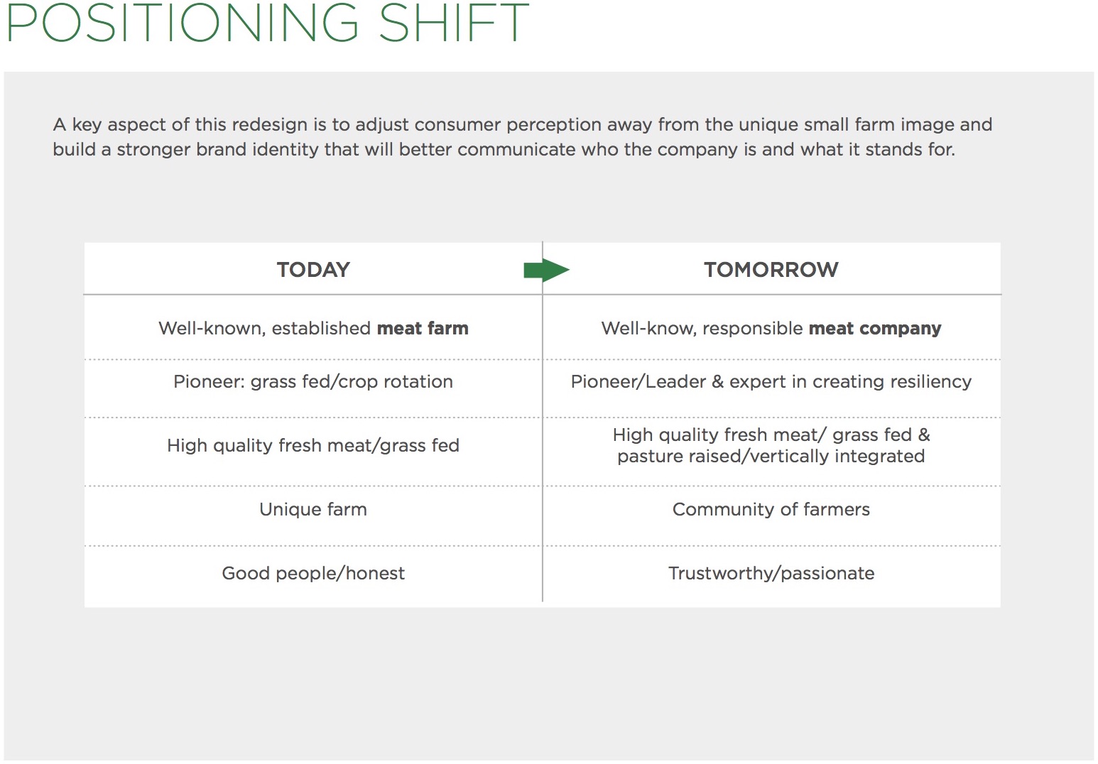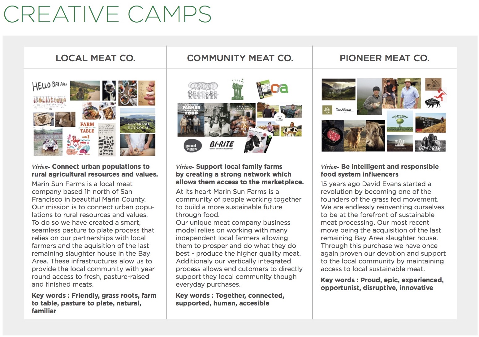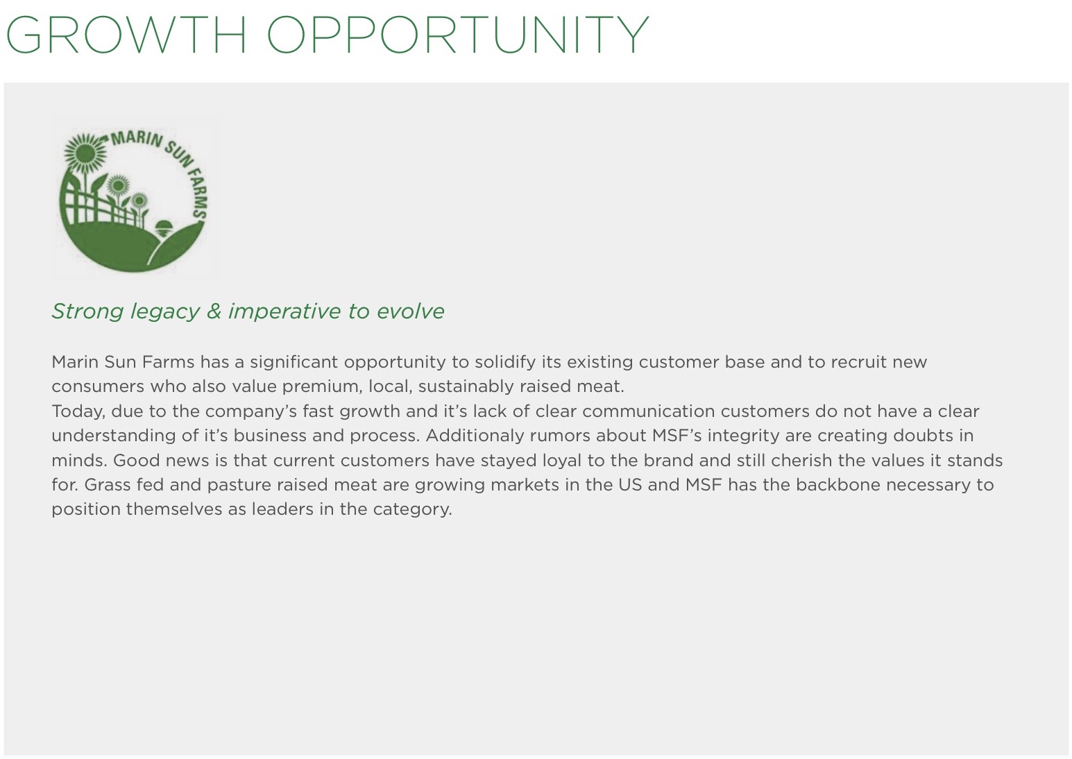 Client objective: Marin Sun Farms' CEO, David Evans was seeking a way to reveal his brand positioning "Local Food for a sustainable future" in a consumer-centric way. He struggled to explain the evolution of his company (from farmers to meat company) and the different aspects of it (farming, producing, distributing) to his customers.